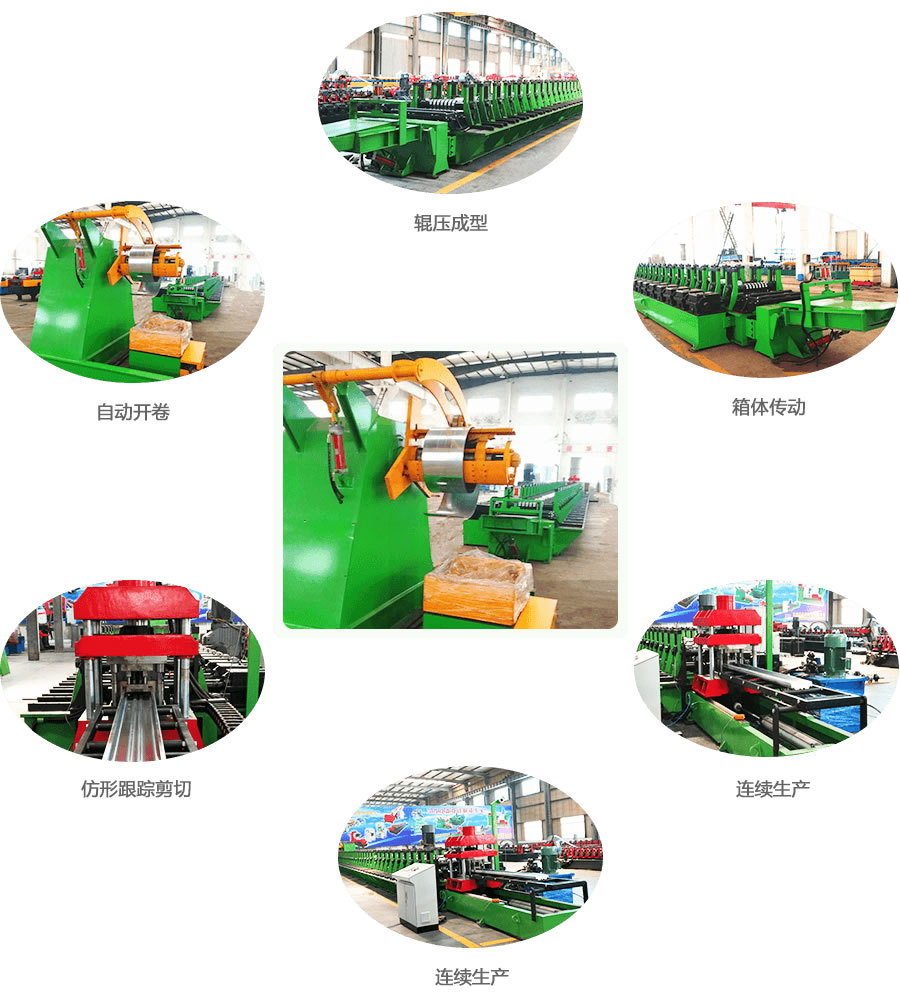 工藝流程: 液壓自動(dòng)開卷→引料裝置→校平→輥壓成型→機(jī)械跟蹤沖孔切斷→托料出板