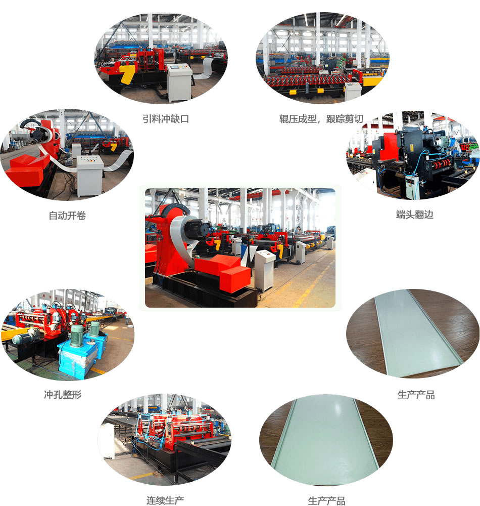 工藝流程: 自動(dòng)開(kāi)卷→引料、沖缺口,剪切→輥壓成型、跟蹤切斷→動(dòng)力輸送→前后端翻邊→沖孔整形