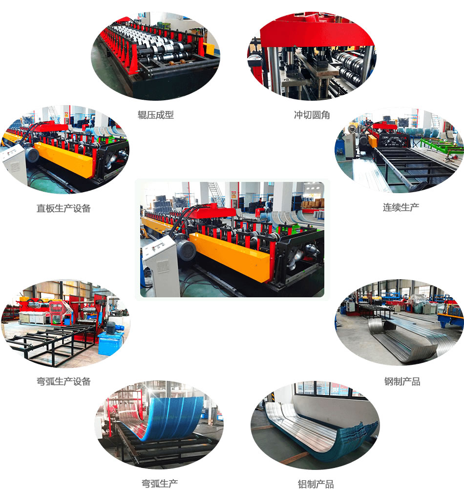 工藝流程:上料 → 導向整平 → 輥壓成型 → 沖孔+沖圓角+切斷→ 輥壓成型 → 出料→彎弧→成品