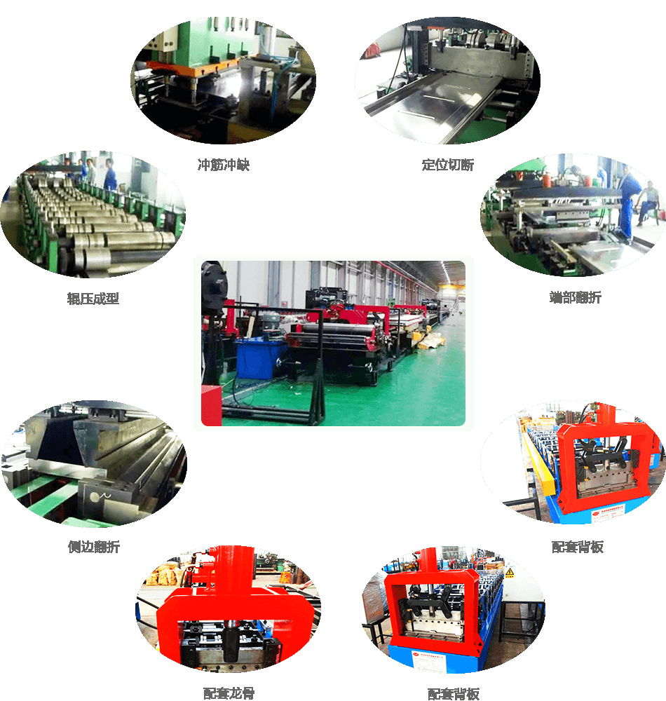 工藝流程: 開(kāi)卷—引料校平—沖孔沖缺—輥壓成型—定位切斷—端部翻折—側(cè)邊翻折—托板出料