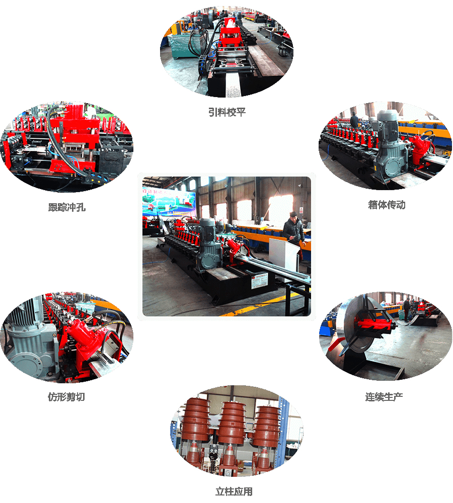 工藝流程: 開卷→整平→機(jī)械跟蹤沖孔→輥壓成型→切斷翻邊→出料